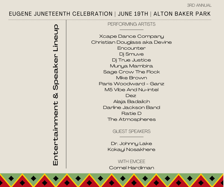 We are proud to announce the entertainment and speaker lineup for the Eugene Juneteenth Celebration 2022 which is taking place in Eugene, Oregon on June 19, 2022.